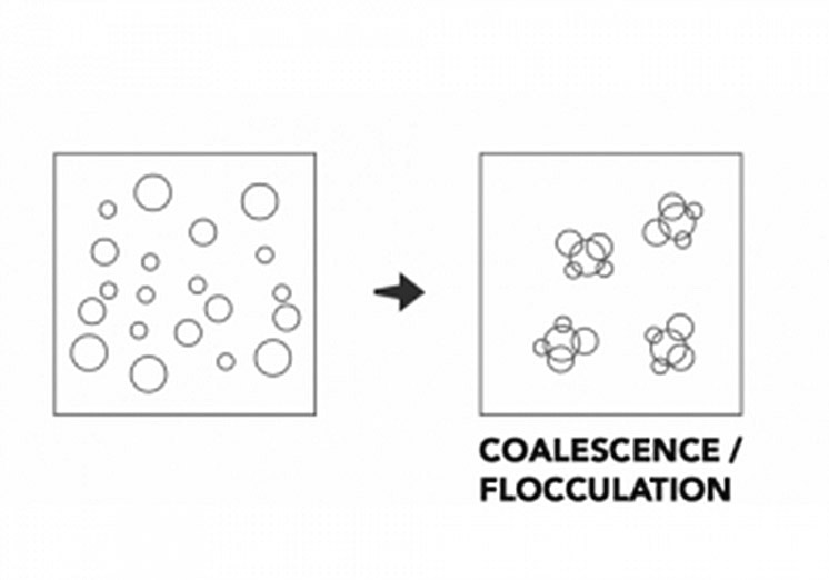 Whereas creaming and sedimentation refer to a collective or global phenomenon, coalescence describes the tendency of suspended media to reassemble and form larger masses. This may occur between media of the same composition and radically, often irreversibly, changes the macroscopic condition of the dispersion. Therefore, these still homogenous mixtures are often no longer suitable for the purpose.